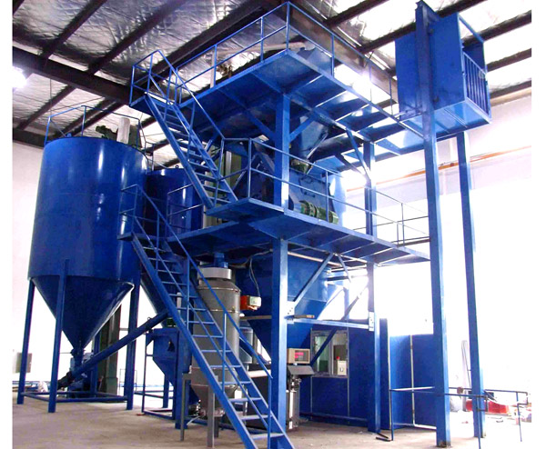 主要配置:原料倉,自動計量配料及稱重裝置,斗式提升機,待混倉,高效混合機,喂料機,成品倉,自動稱量包裝機,脈沖除塵器,支架爬梯平臺,電器控制柜等組成。