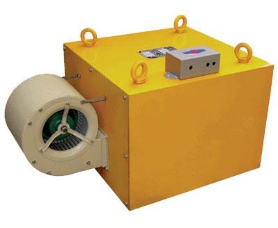 風冷電磁除鐵器,采用空調或軸流風機強迫風冷,增加風道,增大線路與空氣的接觸面積,改善風冷效果。大型除鐵器采用軸流風機,風壓高,風量大,風冷效果強。控制柜采用聯鎖機構,即風機一停,除鐵器勵磁立即停電報警。
